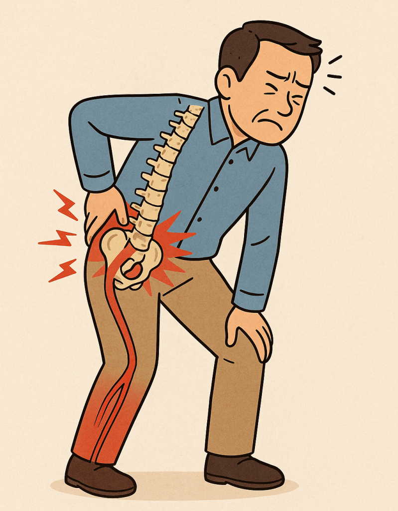 Sciatica is a type of nerve pain caused by irritation or compression of the sciatic nerve, which runs from the lower spine through the buttocks and down the back of each leg. It usually affects one side and can range from mild discomfort to severe, debilitating pain.